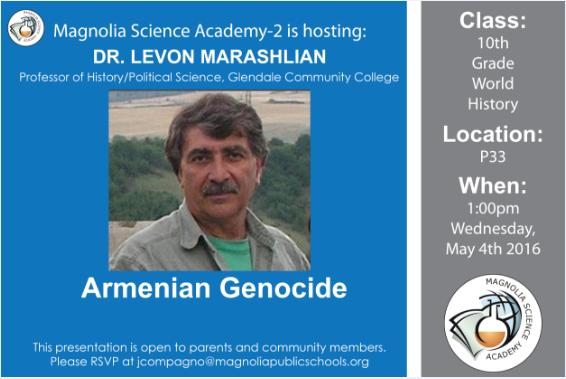 May 4th - Guest Speaker at MSA 2: Professor Levon Marashlian from Glendale Community College
