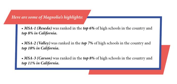 We’re thrilled to share with you that five of our Magnolia schools have been recognized for their incredible work in advancing student achievement for all of our students. Three Magnolia schools were among the top 8% of high schools in the country, according to rankings by the U.S. News & World Report which were released today. The rankings also put MSA-1 and MSA-2 in the top 25 best charter high schools in Los Angeles Unified. Furthermore, in a separate report, three Magnolia schools were listed among the Top L.A. County Public Schools for Underserved Students, according to research conducted by USC and Innovate Public Schools. We are so proud of our students and staff!